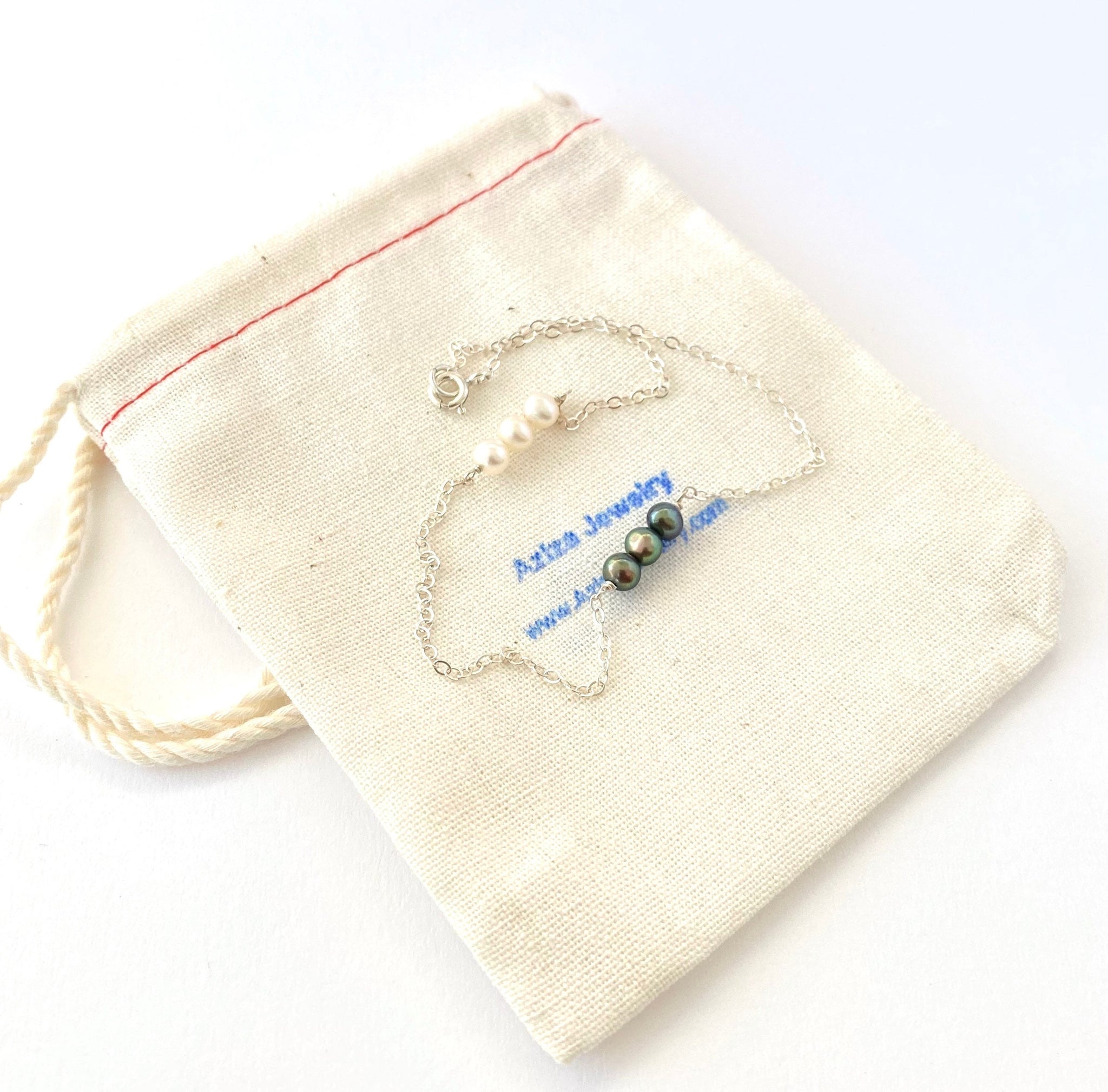Made from small white and black freshwater pearls and delicate sterling silver chain, this pearl ankle bracelet or anklet is a very limited edition. The pearls measure about 4-5mm. DETAILS Pearls symbolize purity and spiritual transformation. Genuine black freshwater pearls in a small cluster are intertwined with sterling silver chain with a small cluster of white freshwater pearls on the opposite end to form this unique anklet.
