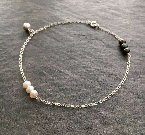 Black and White Pearl Anklet. Black and White Freshwater Pearl Sterling Silver Ankle Bracelet with Bell Charm. Genuine Pearl Anklet.