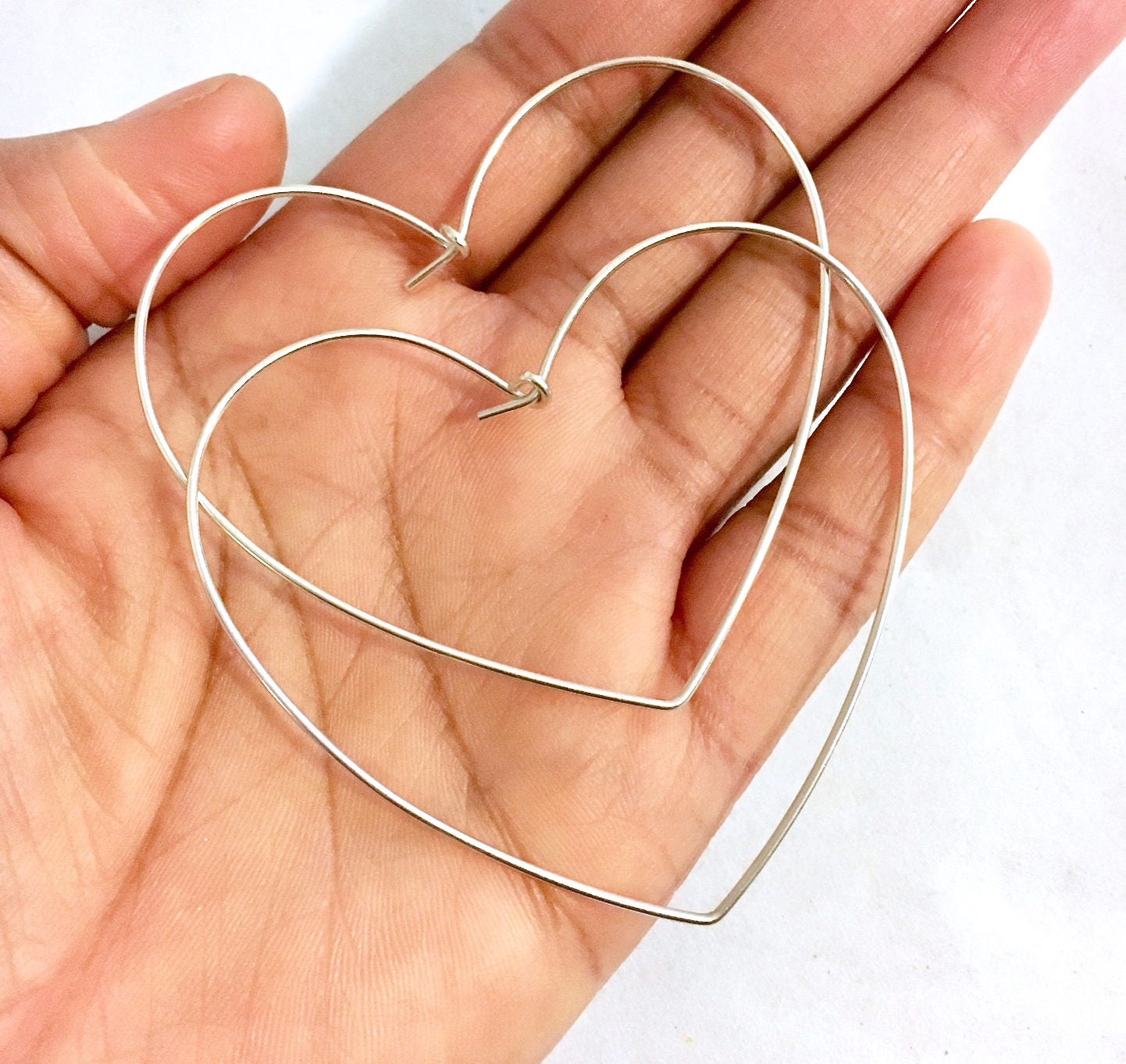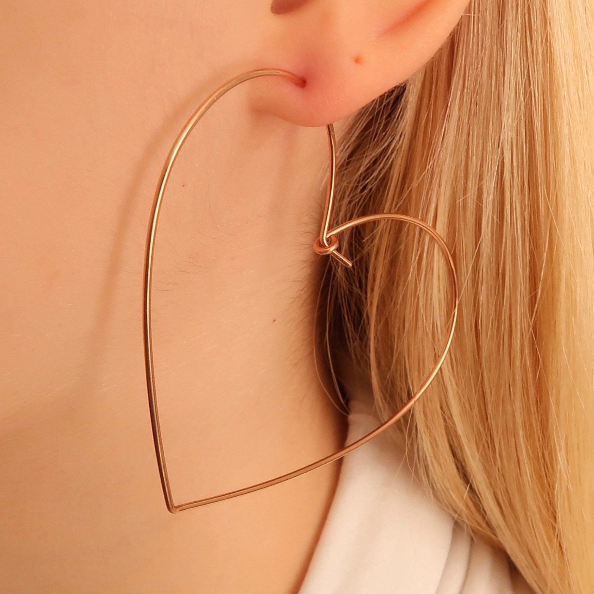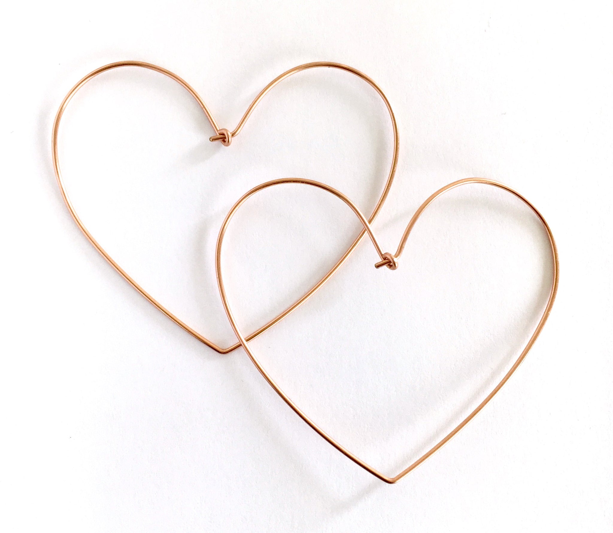 2.5 inch wide x 2.5 inch long Large heart hoop earrings. Select 14k Solid Gold for sensitive ears or to wear in the shower or pool. Handmade using one piece of wire. Made to order within 3-5 business days. Arrives in a gift box and comes with care instructions. Available in Silver, rose gold or white gold in other listings.